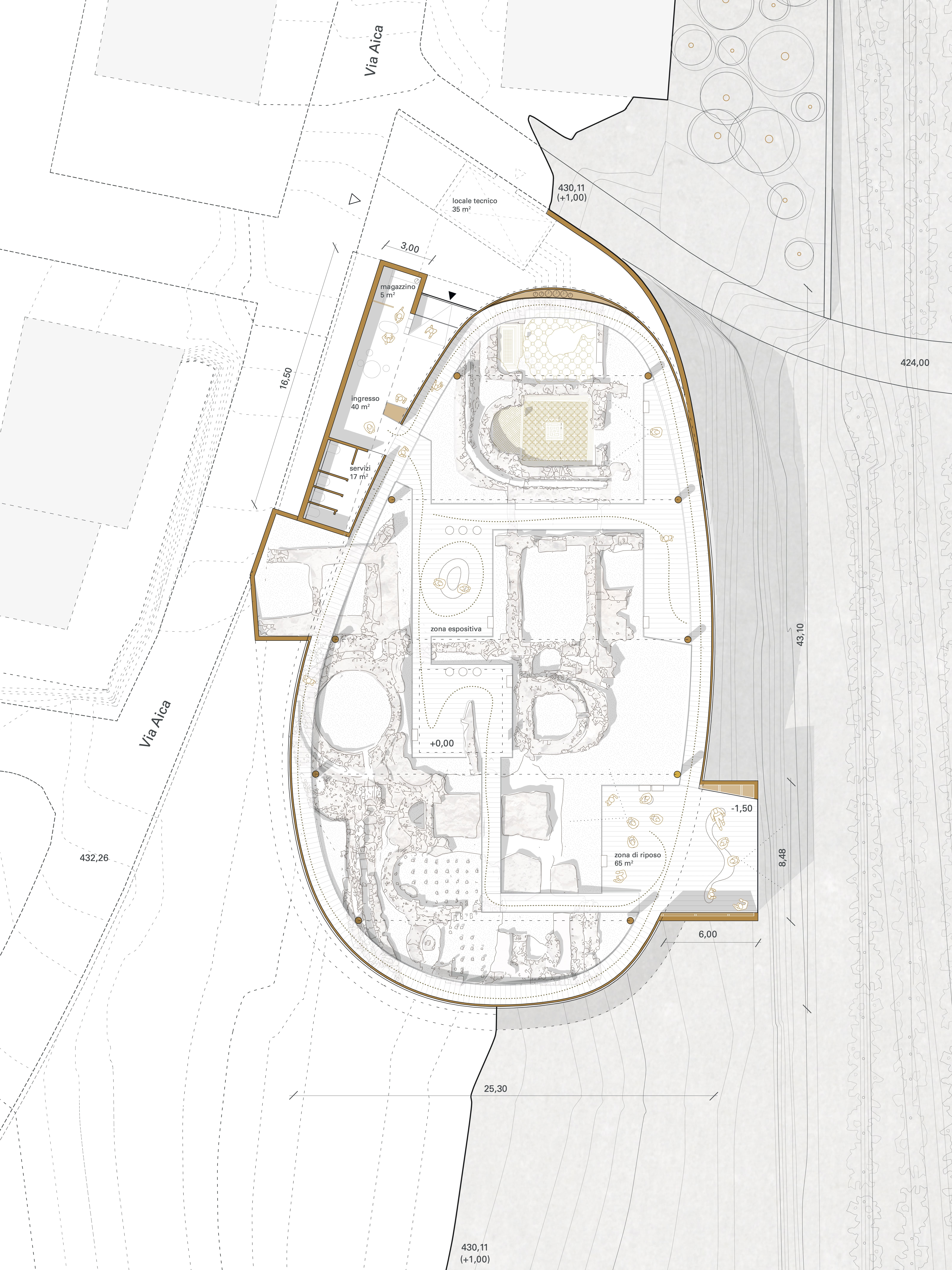 The public route is spread over two levels: a perimeter walkway along the shell, which offers an overview of the site, and an internal walkway through the excavations, which crosses the empty spaces of the villa, telling the history and functions of the different rooms. An accessible panoramic terrace completes the experience, allowing visitors to observe the ruins from outside, even when the exhibition space is closed.