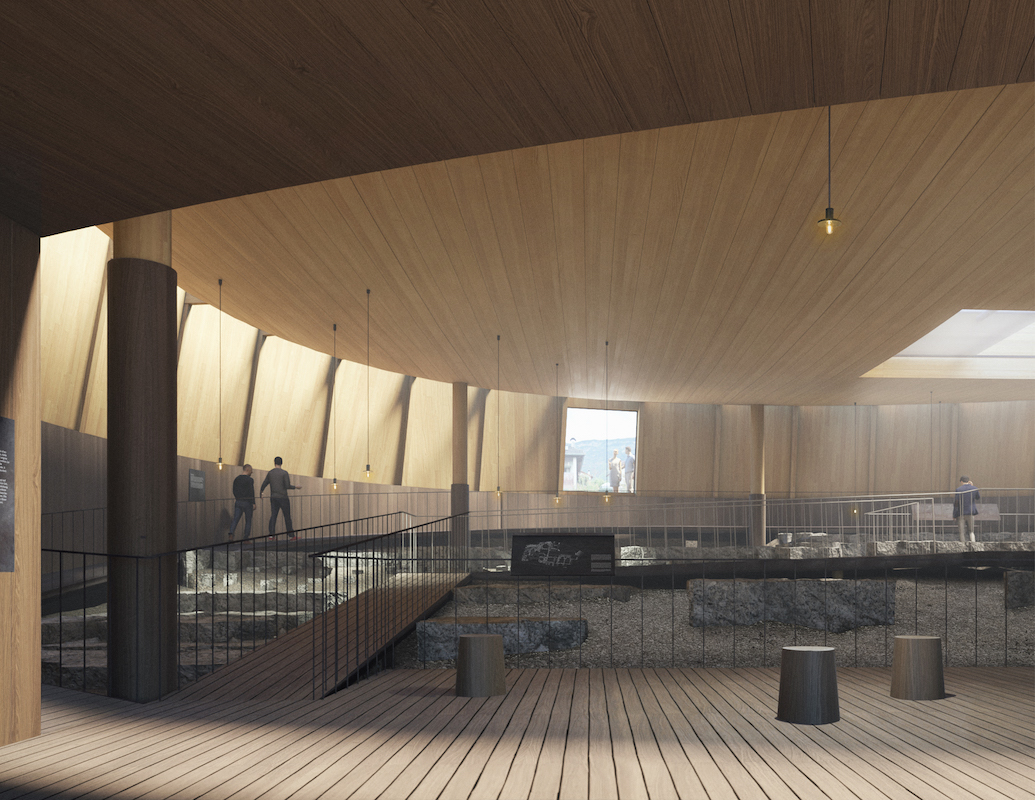 The project distinguishes the circular space of the wooden shell from the service areas and entrance volumes, preserving its identity: the shell becomes the architectural symbol of the excavations, visible even from the outside.